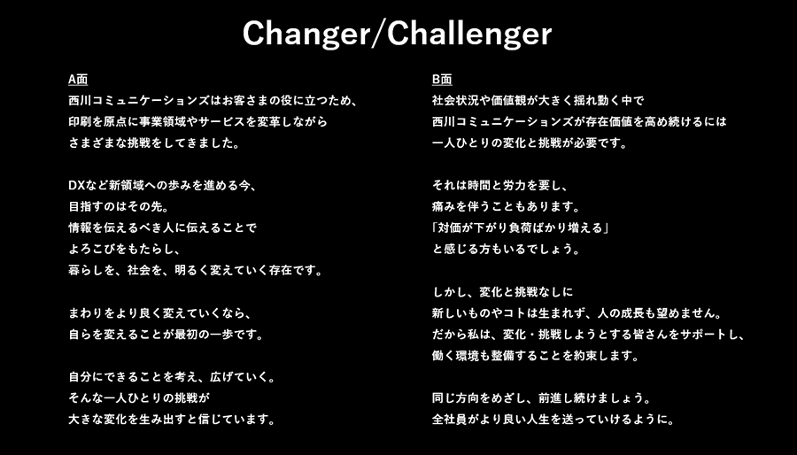 大元にあるのは「西川の歴史は、これまでもこれからも、変える者、挑戦する者の歴史」であるという思いです。そこから「Changer/Challenger」というメッセージが生まれ、さらに会社が目指す姿と従業員の方に目指してほしい姿を表したA面、A面の姿を目指す従業員を支える会社としての約束というB面という構成になっています。